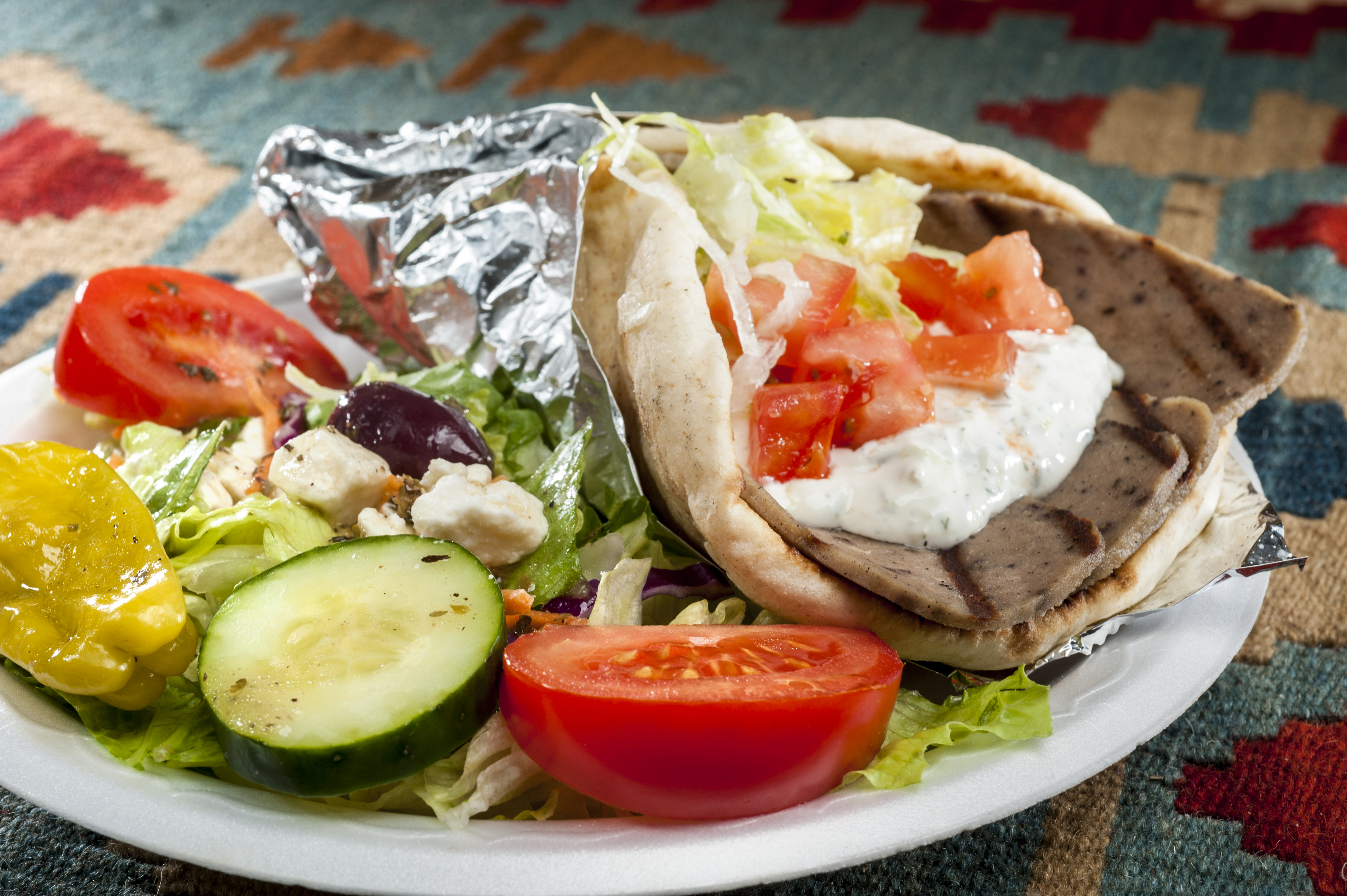 Add a bottomless fountain drink + one side to any gyro, wrap, or burger